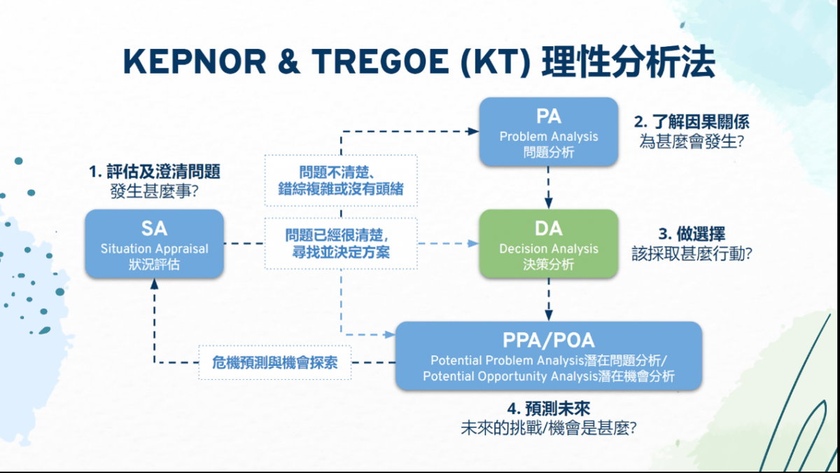 KT法是一種思考系統,即就事情各自的程序,按照時間、場所等,明確區分發生問題的情形和沒有發生問題的情形,由此找出原因和應該決定的辦法。