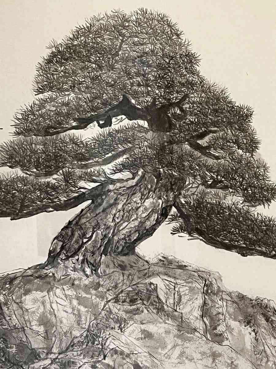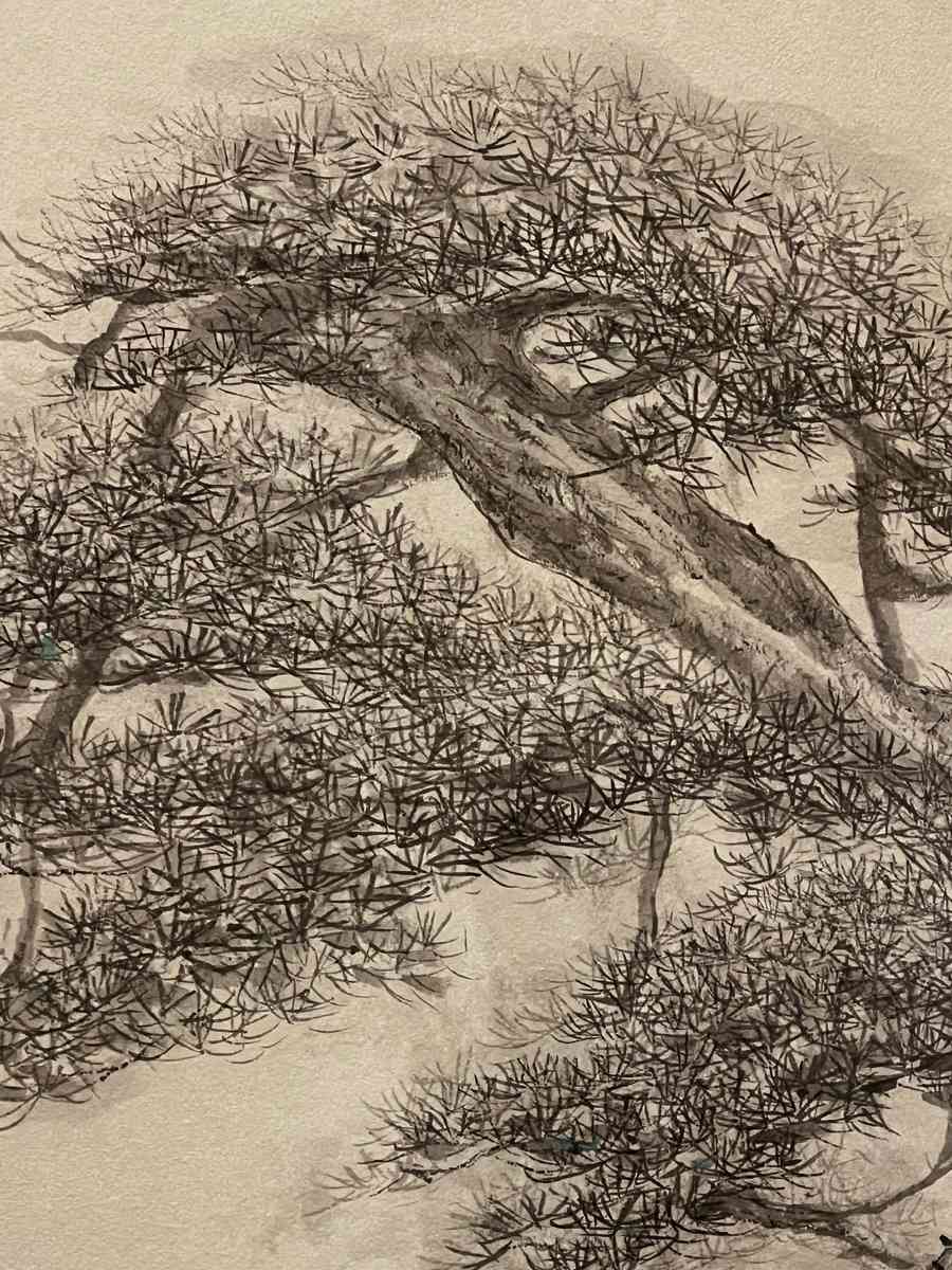 王氏「金刚松」系列画作,既非经文之图解,也非叙事之直陈,乃借松木意象之阐发,超越此母题固有象征意义的文人传统,递传《金刚经》哲学的庄严内涵。在中国文化中,松象征长寿、坚韧、刚毅与气节,历来喻指逆境守心、坚韧不拔、忠贞不渝的君子雅士。画家之作别具格致,尤在妙用留白的绘画语言,令构图超拔出众,展现经文所蕴含的清净寂灭、超然物外之境,或令观者于松影梵音中,体悟「应无所住而生其心」的宁静与隐逸之美。