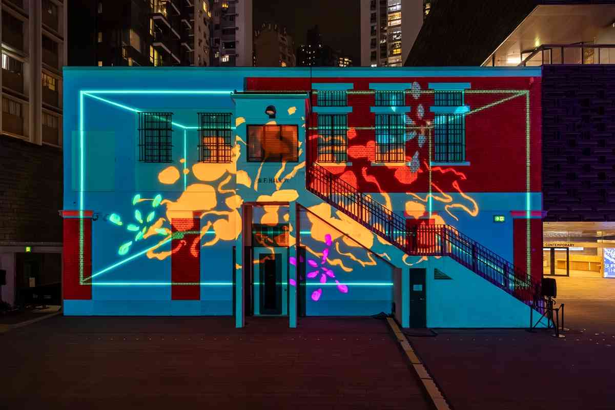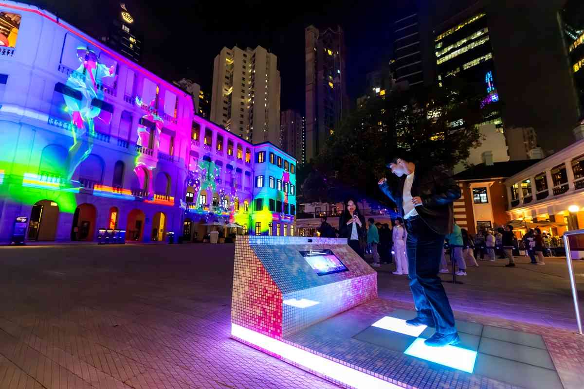 在澳洲創意及技術夥伴 The Electric Canvas ⼀如既往的⽀持下,今年「綻放⼤館」與 The Collective合作,主創團隊擅於運⽤最新科技開拓藝術的可能性,更⾸次引入實時互動體驗。觀眾可於檢閱廣場踏上感應式舞磚,以不同動作與律動觸發立體光雕投影的視覺變化。裝置可追蹤觀眾的⾝體動作,實時投影到營房⼤樓外牆上,讓觀眾化⾝光雕投影匯演的參與者,在⼤型舞蹈派對共同起舞。