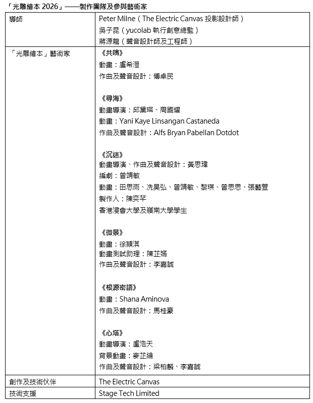 「光雕繪本 2026」邀請觀眾⼀同⾒證本地藝術家的創作蛻變。聲⾳設計師黃思瑋透過作品《沉迷》初探動畫領域,描繪主⾓如何從慾望困局中掙脫無盡絕望;另⼀藝術家盧希澄帶來⾸部個⼈作品《共鳴》,探索點、線、⾯如何透過律動與振動連繫眾⼈;盧浩天則挑戰更⼤規模的建築畫布,作品《⼼塔》橫跨監獄操場外牆與 F 倉外牆,從客觀和個⼈的雙重⾓度,敘述⼀名男孩踏入成年的⼼路歷程。