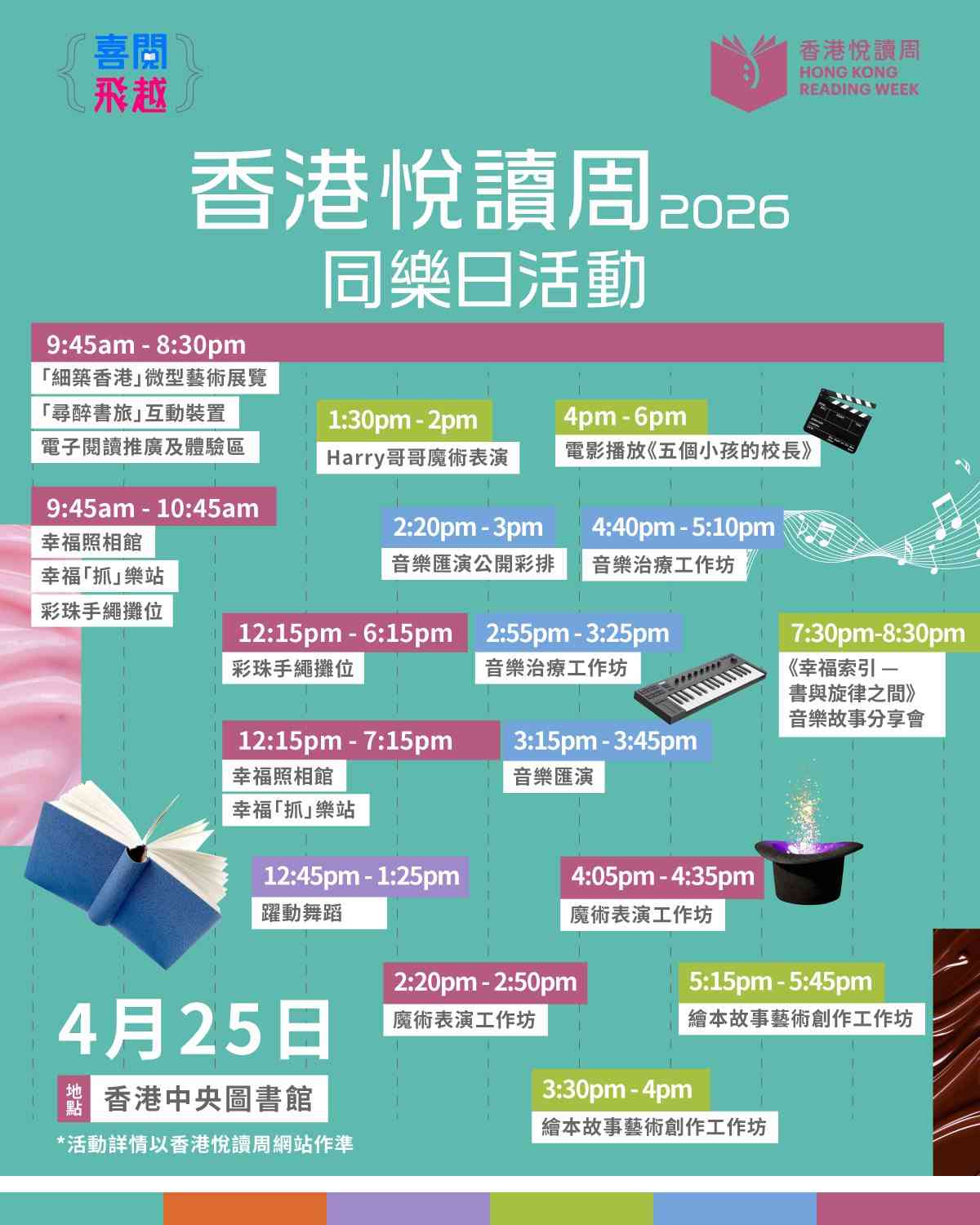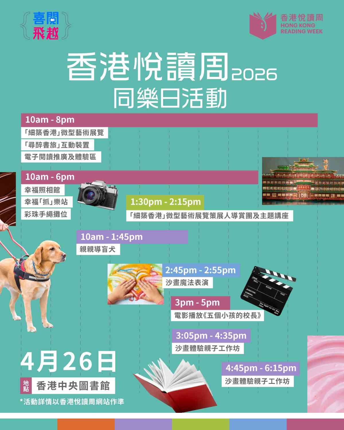 為響應四月二十三日的「香港全民閱讀日」,香港公共圖書館與不同持份者合作,於四月二十日至二十六日舉辦「香港悅讀周2026」,以一連串全港性大型閱讀活動,鼓勵市民享受閱讀樂趣,並養成持久的閱讀習慣,營造全城閱讀氛圍。