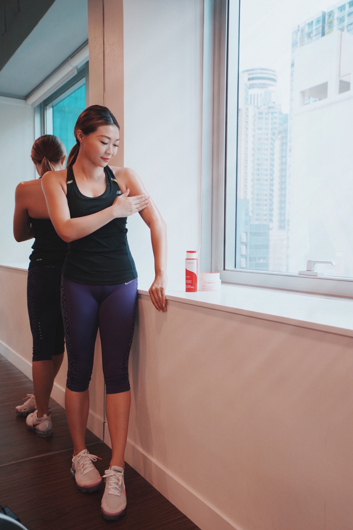 我跟她們分享,我做健身不是為了瘦,而是為了健康也為了體態看起來更好,肉肉也變Firm。做運動前或後,我都會有一個好幫手,也是Clarins的產品,就是Body FIt了!這枝Body Fit已經是第七代了!重點幫助運動塑身效果,幫你鍛練S身型。Body Fit具有水薄荷、雞冠花、酒神菊同冠笄花萃取,這些天然的成分都可以有效維持肌膚彈性,減慢脂肪組織擴大強度及脂肪形成!我一般在塗在我當天做Trainning的位置,例如今次去Rizap我就Train手臂,後背同腰,所以當天我都是重點塗在這些位置。Body Fit可以幫助溶解脂肪,增加燒脂脂肪細胞的強度,提升燒脂力!如果你夏天修身,需要一點外在的幫助,就可以試試啊!