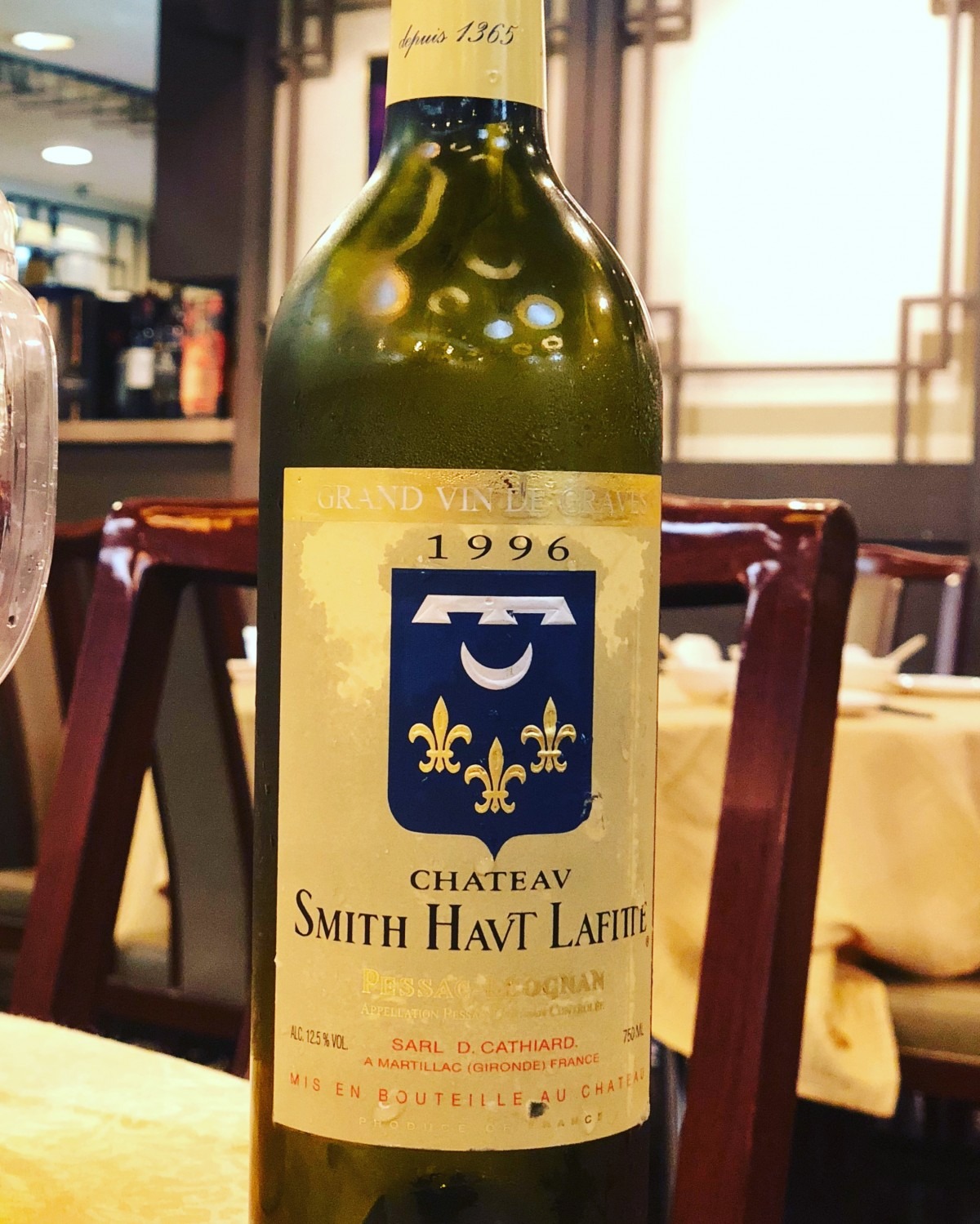 法國波爾多格拉夫Pessac-Leognan 1996 Château Smith Haut Lafitte—已是二十歲的酒,沒呈老態,酒色淺金黃,卻盡是成熟美,芳香優雅,帶無花果、橙皮香、檸檬皮、香草、杏仁片和一絲絲晒乾丁香氣息,酸度和諧適中,味道豐富,具有深度,可以慢嚥享受上一個晚上,屬讓人喝後會滿足地笑的酒。