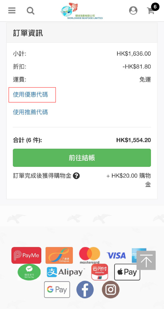- 此優惠代碼只適用於https://www.worldwide-seafood.net網上購物。