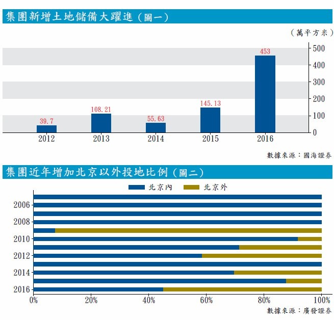 土儲大增的另一原因,是集團同時向北京以外的核心二線城市埋手,此舉除分散來自京城的調控風險,亦助集團加快轉型為區域型發展商。去年集團在北京以外拿地比例超過一半(見圖二),比重為自2009年集團開始向外拓展以來最高。其中南京及重慶項目以近50億元(人民幣,下同)取得,總建築面積達65萬平方米。除了北京、南京及重慶外,集團於天津、青島及成都均有營運項目,當中北京及天津皆鄰近未來的雄安新區,集團的地方政府背景及在兩市的建設經驗,未來或在雄安新區大派用場。